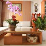 Khu vực tiếp khách hiện đại, đơn giản gồm bộ ghế sofa nhỏ gọn cùng bàn trà dáng tròn độc đáo. Phía trên trên trần nhà được bố trí một chiếc đèn chùm trang trí có kiểu dáng độc đáo góp phần tạo cảm giác sang trọng mà ấm áp cho không gian phòng khách.