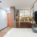 Với diện tích căn hộ không quá lớn, nên đồ nội thất được chọn có kích thước vừa phải với mẫu mã đơn giản, hiện đại. Không gian phòng khách được thiết kế liền kế với khu vực phòng bếp của căn hộ. Vừa góp phần mở rộng diện tích vừa tạo nên sự thuận tiện linh hoạt cho mọi hoạt động của các thành viên.